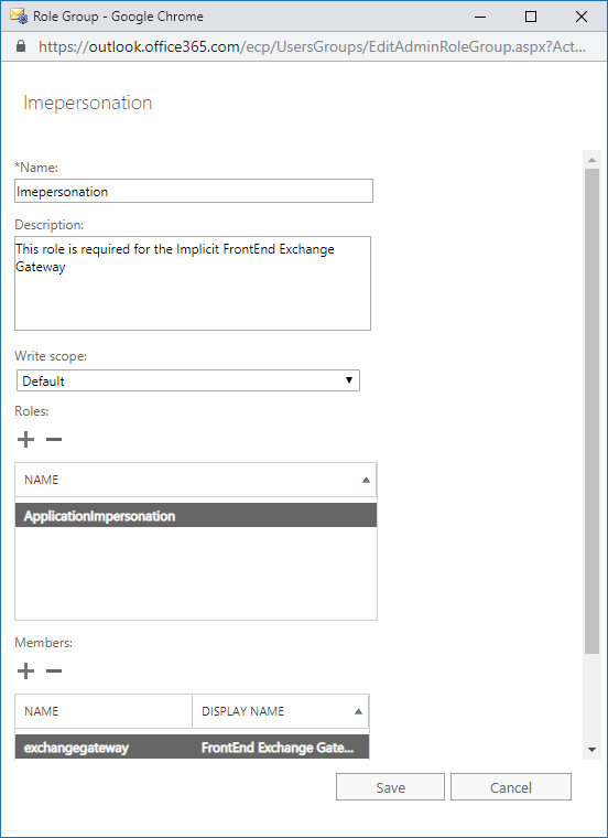 - Run the New-ManagementRoleAssignment cmdlet to add the permission to the service account to impersonate users that are members of the “Implicit FrontEnd User Group”. This is done by defining a Management Scope that limits the scope of permissions to the AD user group: