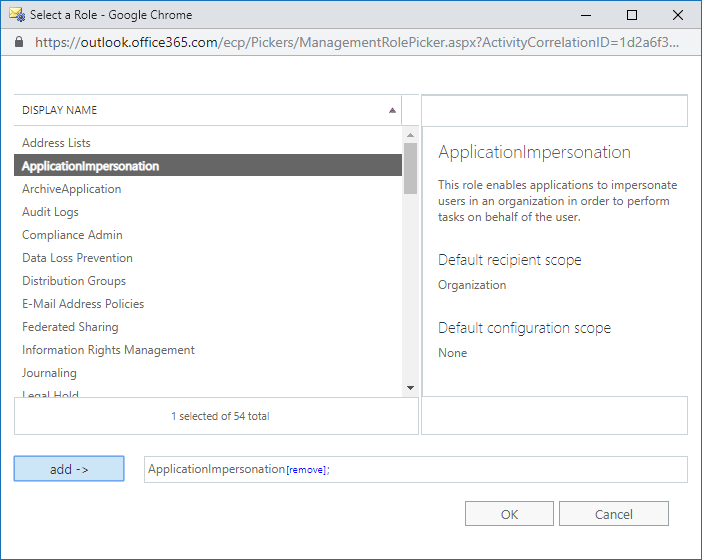 - Click the + to add a role. From the list of available roles (Fig. 3.), select the ‘ApplicationImpersonation’ role and click ‘Add’. Then click OK.