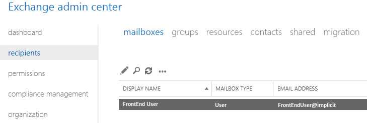 - Log in to Exchange or your Office 365 Admin account and create a new user account for the service account e.g.: “FrontEnd Service Account”.