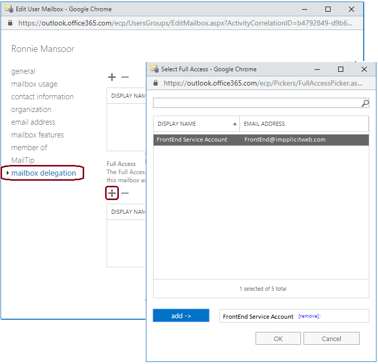 - Repeat steps 5 to 9 for each user mailbox who will be participating in the Implicit FrontEnd synchronization.