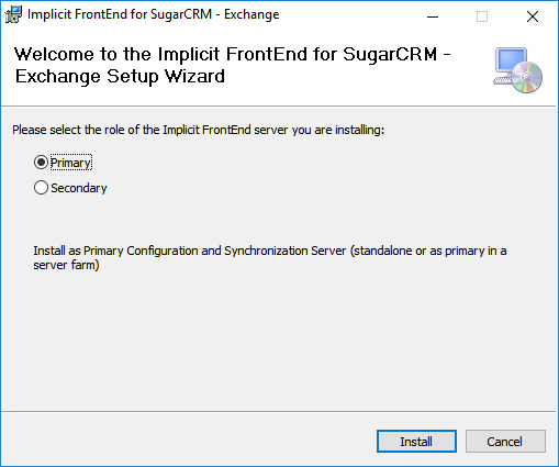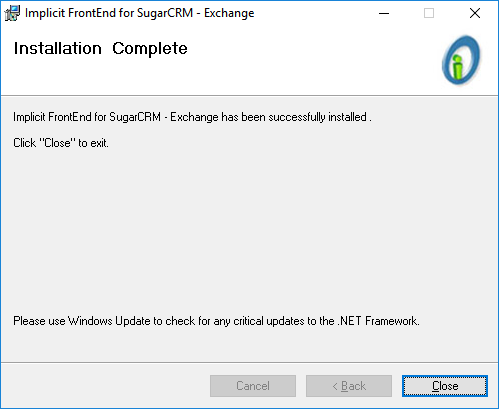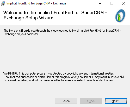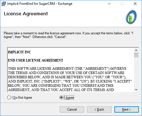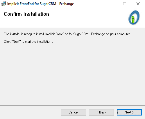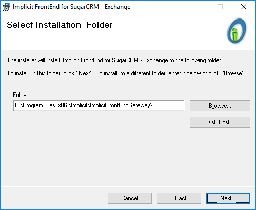 By default the installation folder will be set to: \Program Files\Implicit\Implicit FrontEndSugarCRMExchnage.
