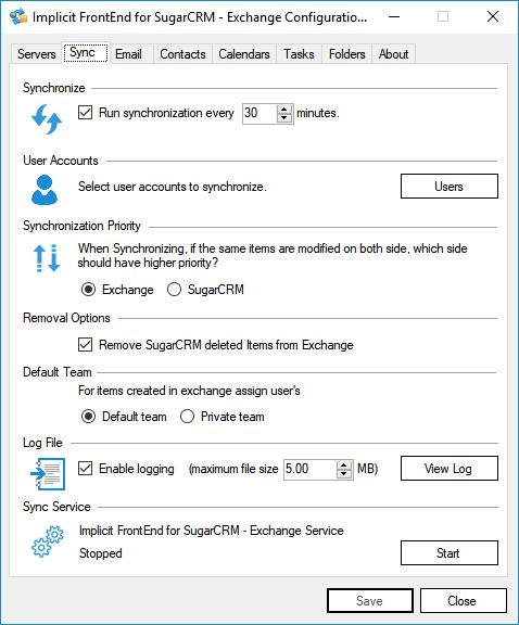 - Stop/Start service – You may stop and start Implicit Synchronization system service from within the configuration tool