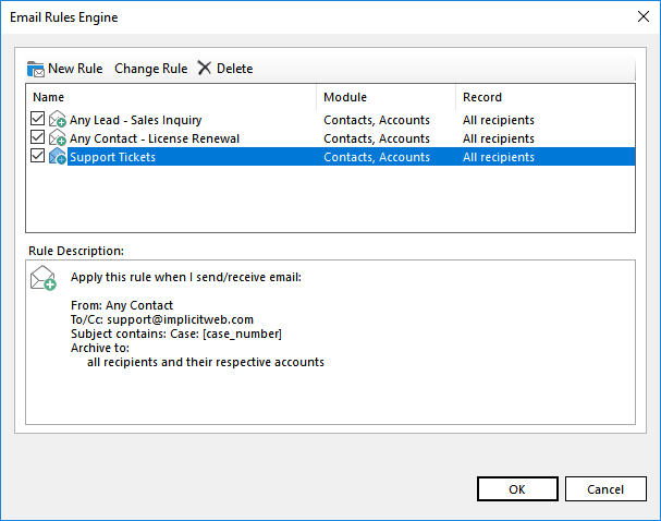 - Any Contact – Select ‘Any Contact’ if you would like to create a rule that applies to emails from/to any CRM contact