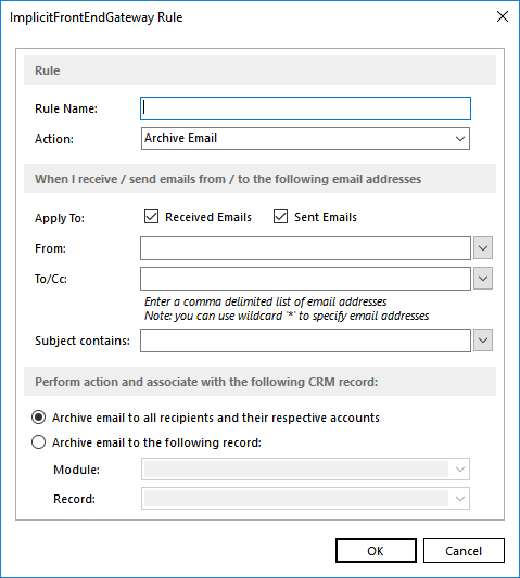 at run-time based on the email addresses of the recipients (if they are found as CRM contacts/leads and their parent accounts - Archive to a specific record that is determined at the time of creating/editing the rule