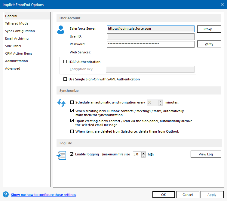 Enter the Salesforce server URL and the user name and password that you use to login to Salesforce.