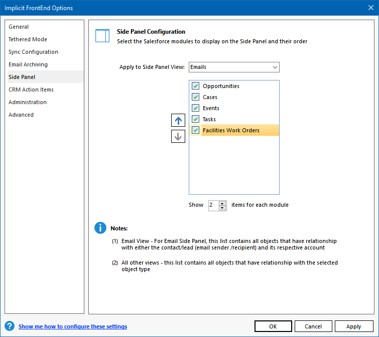 - Side panel – Which objects to show on the side panel and how many