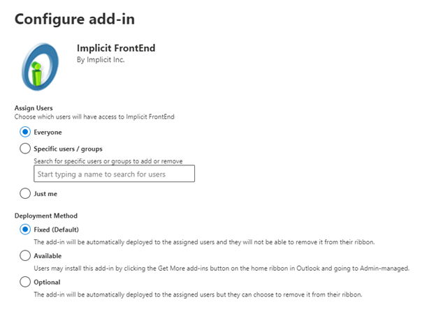 Next, select the users who will have access to Implicit Outlook add-in and set the deployment method to ‘Fixed’.