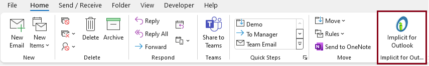 When Implicit Outlook add-in has been deployed to Outlook, it will appear on the ribbon in Outlook as shown below: