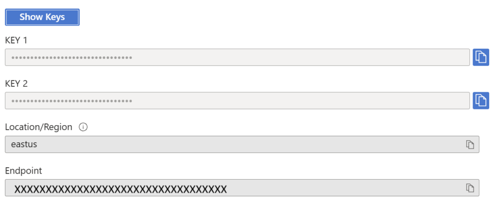 Click the link next to ‘Endpoints’ to view the URL for the service endpoint and the key (use the first key value):