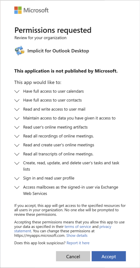 1. Start by granting permissions on behalf of the organization for users to use the Implicit for Outlook Desktop App.