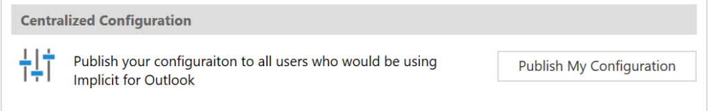 Once you’ve configured the settings via the desktop app, you can publish the configuration by going to the administration tab and clicking ‘Publish My Configuration’.  This will publish the configuration to a document on the CRM which will be automatically retrieved and applied to all Implicit users.