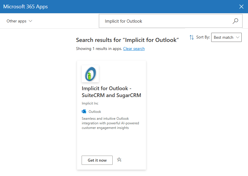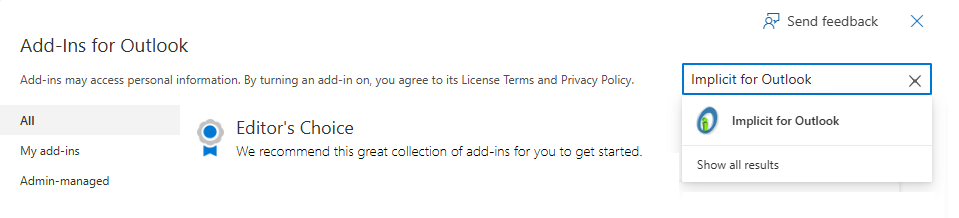- In the Search box, enter “Implicit for Outlook”