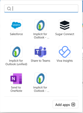 Click the Apps button and make sure Implicit for Outlook add-in shows up in the list of available apps: