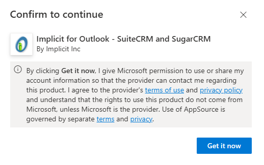 If you have not yet installed Implicit for Outlook on the Intelliflo Store, you will be prompted to install it now. Click the “Install it Now” button. You will be redirected to the Intelliflo Store to install the app.