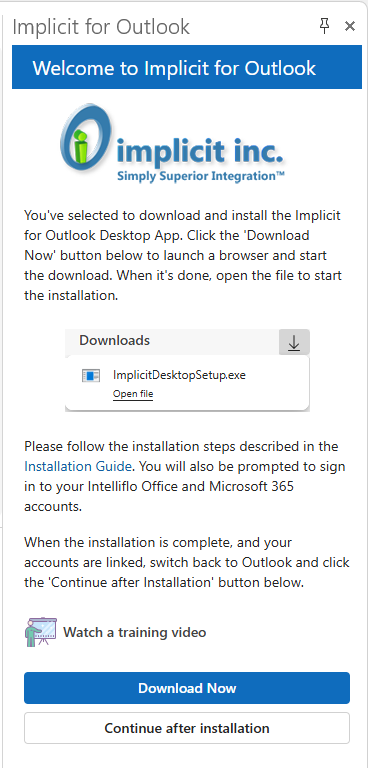 If you have permissions to install application on your desktop, click the “Download and Install Implicit for Outlook Desktop App”.