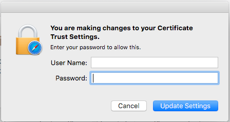 - Click ‘Visit Website’. You will prompted to enter your MacOS credentials and click ‘Update Settings’ to confirm making changes to your Certificate Trust Setting: