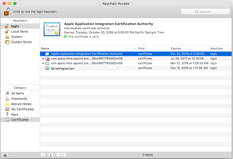 - If you like, you launch the keychain Access app to verify that the certificate has been added: