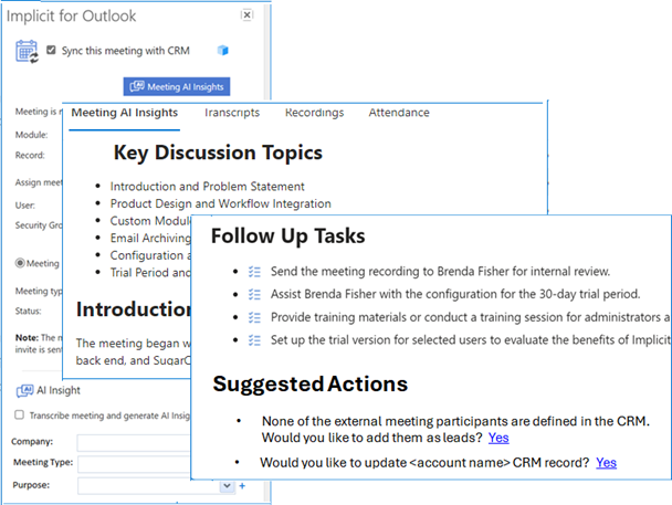 - Leverage CRM information as context from the meeting. By leveraging the history of the account from the CRM as context for the meeting, Implicit ensures high quality AI analysis.