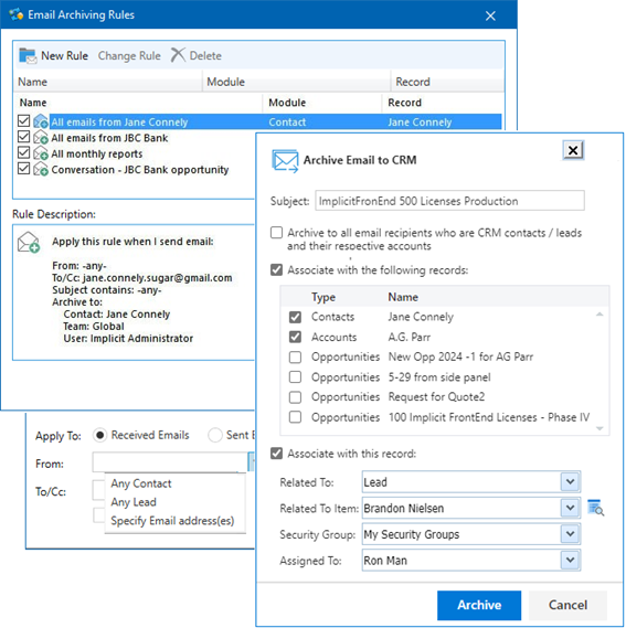 - Manual Email Archiving – Manually archive emails to multiple CRM records. Archive to standard or custom modules.